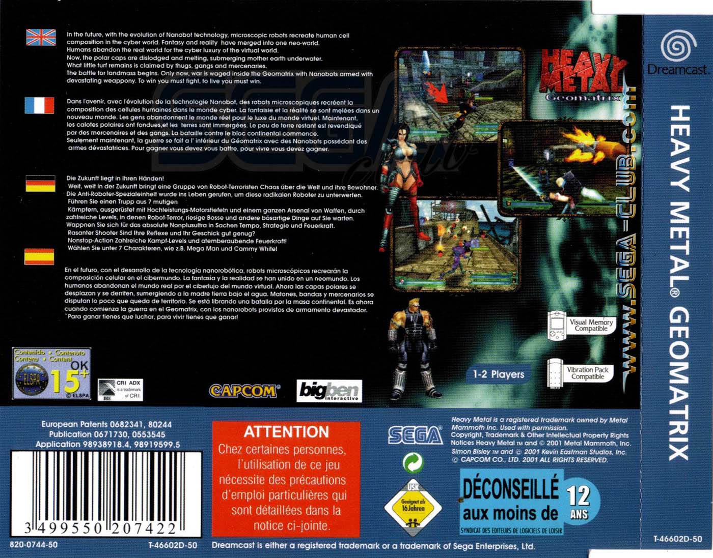 Bei Heavy Metal Geomatrix handelt es sich um ein 3D-Kampfspiel, das in verschiedenen Arenen stattfindet. Hierfür arbeiteten Capcom und SEGA zusammen. Entwickelt wurde das Spiel durch Capcom unter der ‚Heavy Metal‘-Lizenz, was zwischen 1977 und 2023 als amerikanisches Science-Fiction- sowie Fantasy-Comics-Magazin bekannt war. Veröffentlicht wurde es u.a. durch Metal Mammoth Inc., was als Lizenzinhaber auf dem Dreamcast-Spiel betitelt ist. Dieser Publishing-Name der Magazine wandelte sich später zur Heavy Metal Media, LLC. Informationen zu Heavy Metal gibt es unter: heavymetal.com