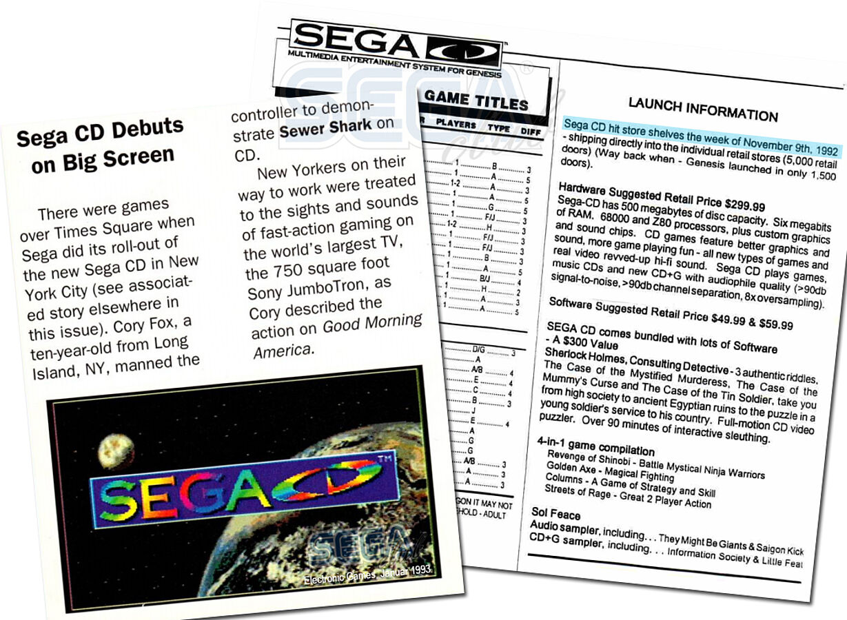 1993 jedenfalls gab es weitere Neuigkeiten zu Nintendos Add On: ein 32-Bit Prozessor würde die Kraft haben, die SEGA im Grunde nur mit der Kombination von Mega-CD und 32X schaffte. SEGA plante dagegen bis Ende 1993 bereits weitere 50 bis 60 Spiele, sodass man auf insgesamt 75+ Spiele kommen würde. Tom Kalinske, Präsident SEGA of America, wies im Interview mit Electronic Games im Januar 1993 auf Folgendes hin: „Während Nintendo dann sein lang verschobenes CD-ROM System mit seiner ersten Generation an Spielen veröffentlicht (…) wird SEGA bereits in der dritten und möglicherweise sogar vierten Software-Generation stecken.“ Er deutete darauf hin, dass immer mehr Third-Party Entwickler auf den Mega-CD aufspringen – zuletzt auch Electronic Arts und Konami. SEGA fürchtete sich insofern nicht vor Nintendos neuer CD-Maschine.