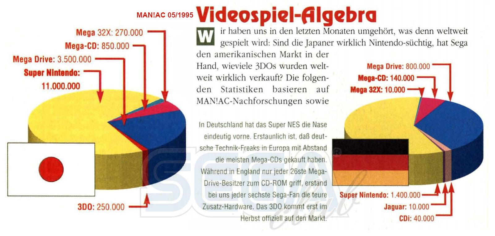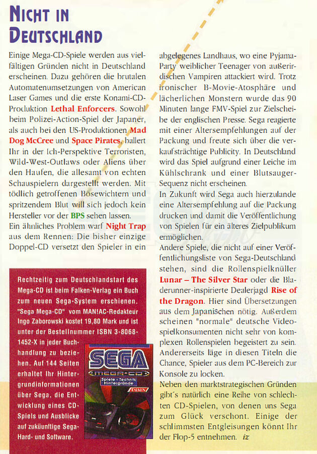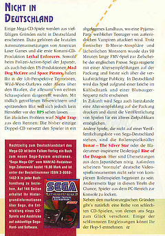 Zudem erschienen mehrere Mega-CD Spiele in Deutschland nicht, worüber das deutsche Magazin Maniac im November 1993 berichtete: „Dazu gehören die brutalen Automatenumsetzungen von American Laser Games und die erste Konami-CD-Produktion ‚Lethal Enforcers‘. Sowohl beim Polizei-Action-Spiel der Japaner, als auch bei den US-Produktionen ‚Mad DogCree‘ und ‚Space Pirates‘, ballert Ihr in der Ich-Perspektive Terroristen, Wild-West-Outlaws oder Aliens über den Haufen, die allesamt von echten Schauspielern dargestellt werden. Mit tödlich getroffenen Bösewichtern und spritzendem Blut will sich jedoch kein Hersteller vor der BPS sehen lassen.“ BPS – die Bundesprüfstelle für jugendgefährdende Schriften – schützte schon damals die deutsche Jugend vor Sex- und Gewaltdarstellungen in Film, Büchern und Videospielen. Dies traf auch das Spiel „Night Trap“. RPG-Hits wie „Lunar: The Suilver Star“ oder „Rise of the Dragon“ wurden aufgrund der notwendigen Lokalisierungen nicht aus dem japanischen Raum nach Europa gebracht. Anders sah es mit Spielen wie „Sonic CD“ oder „Ecco the Dolphin“ aus, wobei der Sonic-Titel – erschienen ab Oktober 1993 – zum begehrenswertesten Spiel auf Mega-CD wurde. Über die japanischen Verkaufszahlen zum 20. März 1994 berichtete das Magazin Mega: Demnach konnte SEGA bis dahin 380.000 Einheiten des Mega-CD absetzen. Der Mega Drive wurde bis zu diesem Tag 3,45 Millionen Mal in Japan verkauft. Das deutsche Magazin Maniac berichtete von 850.000 zu 3,5 Millionen Einheiten in Japan sowie von 80.000 zu 2,1 Millionen Einheiten in Großbritannien zum Jahresende 1994.