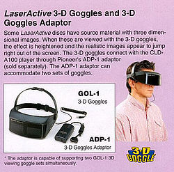 Die ursprünglich genannte „LaserActive 3-D-Goggle“ (GOL-1) ist ein weiteres Zubehör für Pioneers Gerät. Sie verwendet ein 3D-System mit aktivem Shutter, das mit mindestens sechs 3D-fähigen LD-ROM-Softwaretiteln kompatibel ist: „3-D Museum“, „Vajra 2“, „Virtual Cameraman 2“, “Dr. Paolo No Totteoki Video“, „Goku“ und „3D Virtual Australia“.