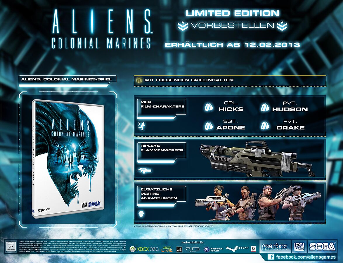 LONDON, 1. Juni 2012: SEGA® Europe, Ltd. Gearbox Software und Twentieth Century Fox Consumer Products geben heute bekannt, dass es sowohl eine „Limited Edition“ als auch eine „Collector’s Edition“ für das voller Spannung erwartete Computerspiel Aliens: Colonial Marines™ geben wird. Das Spiel wird am 12. Februar 2013 weltweit veröffentlicht. „Limited Edition“ und „Collector’s Edition“ bieten den Spielern eine Vielzahl von einzigartigen und exklusiven Inhalten der Welt von Aliens, einschließlich einer Reihe von im Mehrspielermodus spielbaren Charakteren des Films aus dem Jahre 1986. Beide Editionen können ab heute vorbestellt werden.