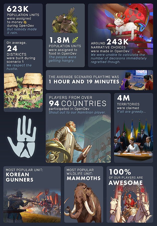 Amplitude Studios werden in ihren Community-Kanälen Details dazu bekanntgeben, wie sie das Feedback in den kommenden Wochen umsetzen. Zusätzlich hat das Team von HUMANKIND eine Info-Grafik mit zahlreichen OpenDev-Fun Facts erstellt, die sie heute veröffentlichen. Spieler, die bisher noch keine Gelegenheit hatten, das Angebot von OpenDev zu nutzen, werden zu einem späteren Zeitpunkt erneut Gelegenheit dazu bekommen.