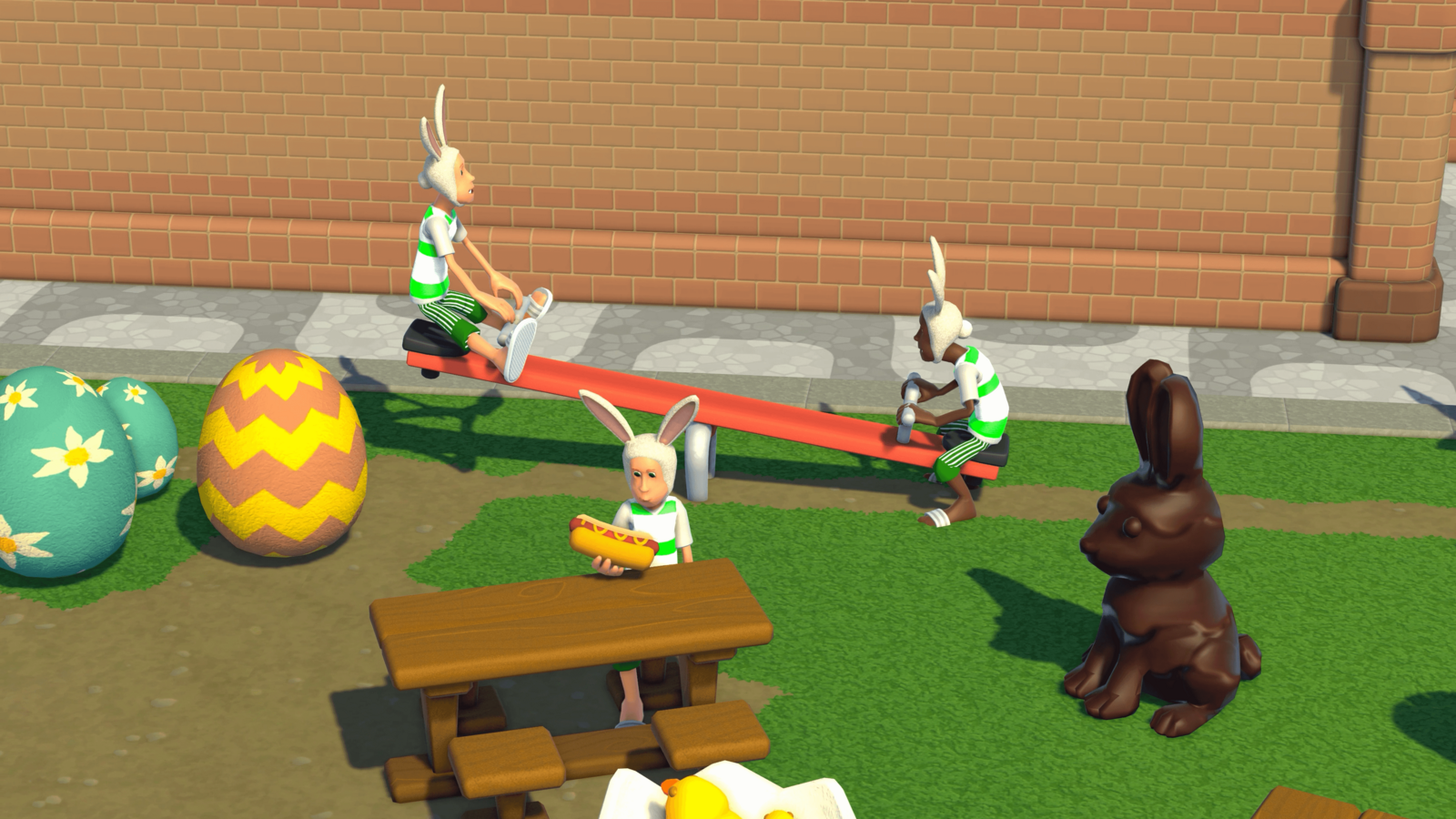 Neben der Eiersuche führt das Frühlings-Update für Two Point Campus ein neues Kostüm ein, das süße Hasenohren-Outfit, sowie lustige Frühlingsgegenstände wie Schokoladenhasen, dekorative Küken und ein riesiges platzierbares Ei. Mmmh, ein Ei!