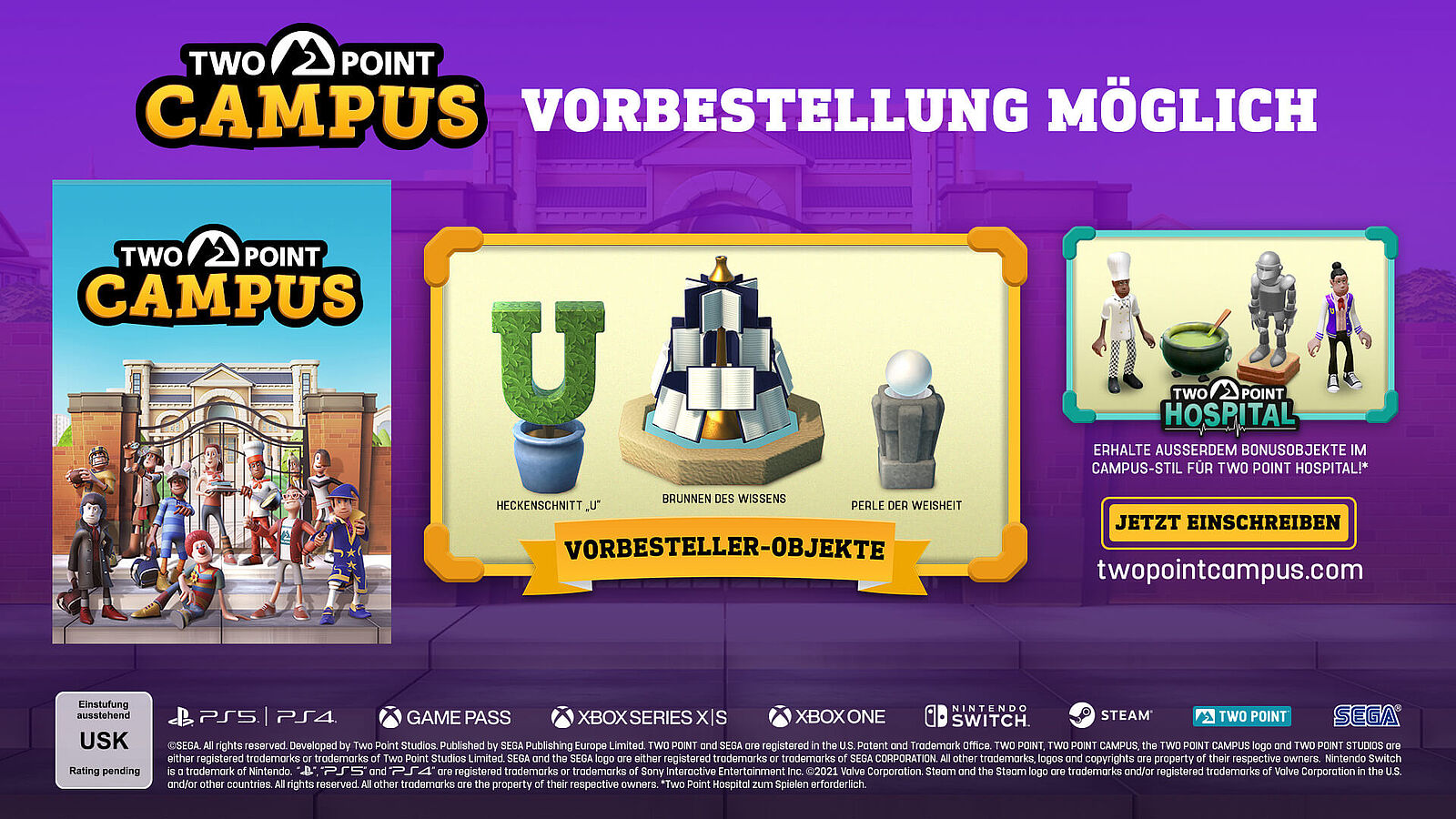 LONDON, England, 27. Januar 2022: SEGA Europe Limited und Two Point Studios Limited freuen sich, gemeinsam bestätigen zu können, dass das mit Spannung erwartete Spiel Two Point Campus™ am 17. Mai 2022 für PC und Konsolen erscheinen wird! Spieler und Spielerinnen können auf TwoPointCampus.com ein physisches Exemplar des Spiels vorbestellen oder Two Point Campus für Steam, Sony PlayStation® 4|5, Microsoft® Xbox One und Xbox Series X|S digital über die First-Party-Stores erwerben – der Vorverkauf für Nintendo Switch über den eShop folgt in Kürze. Two Point Campus wird außerdem ab dem ersten Tag im Xbox Game Pass für Konsolen und im PC Game Pass verfügbar sein. Mit dem neuen Trailer kann man sich ab sofort mal auf das Spiel einstimmen.