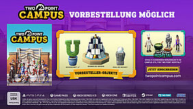 *Besitzer von Two Point Hospital, die ein physisches Exemplar von Two Point Campus vorbestellen, erhalten die kostenlosen Gegenstände im Spiel, wenn Two Point Campus am 17. Mai 2022 erscheint. Hospital-Besitzer, die Campus digital für Steam, Xbox oder PlayStation vorbestellen, können ihre kostenlosen Gegenstände sofort abholen. Spieler, die Hospital für Nintendo Switch besitzen, können Campus schon bald über den Nintendo eShop vorbestellen, wodurch die kostenlosen Gegenstände zum Start freigeschaltet werden.