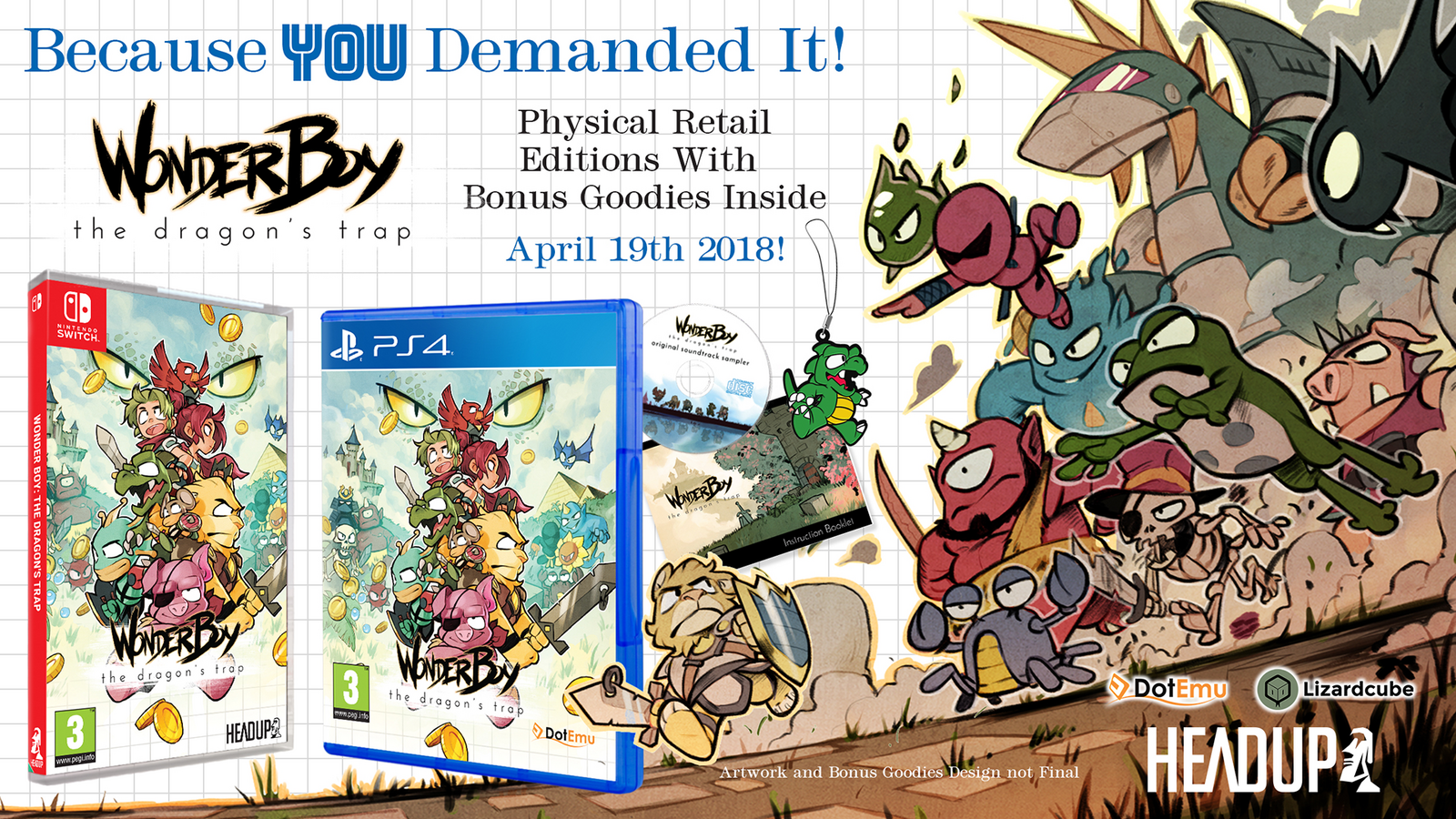 19. April 2018: Das Remake des SEGA Spiels Wonder Boy III: The Dragon’s Trap ist seit heute im Handel erhältlich. Dotemu und Headup Games bringen das bisher nur als Digitalversion erhältliche Spiel für PlayStation 4 und Nintendo Switch in den stationären Handel.