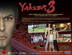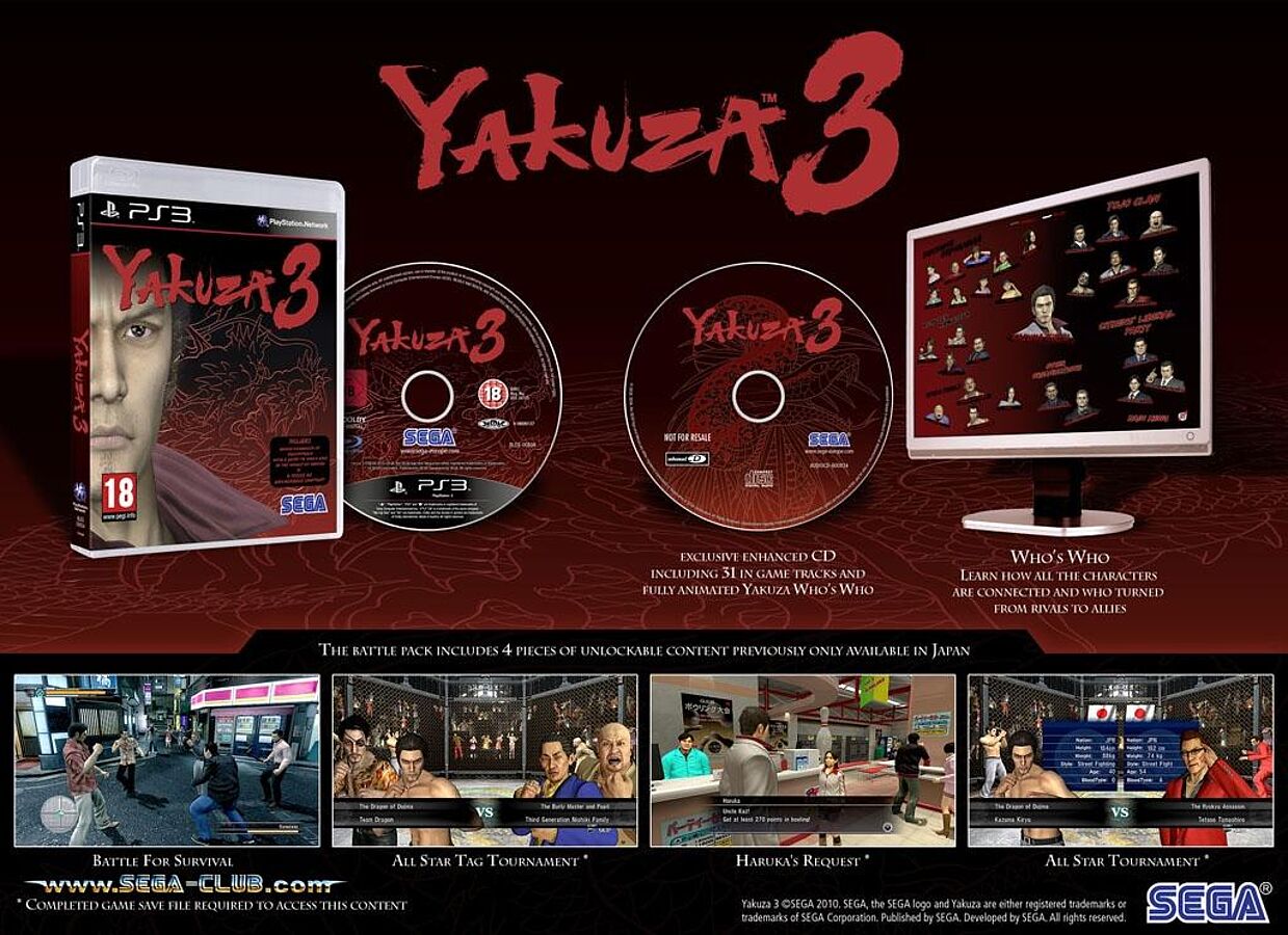 München, 15. Februar 2010: Yakuza 3 - ab 12. März für PS3 erhältlich - wird in Europa exklusiv als Premium-Edition erscheinen. Diese bietet neben einer extra Soundtrack-Disc mit 31 InGame-Tracks auch einen „Who is Who“-Stammbaum der Yakuza-Charaktere. Zudem erwartet die Fans freischaltbarer Content, der bisher nur in Japan erhältlich war: Battle for Survival, zwei All Star Tournaments sowie Haruka’s Request.