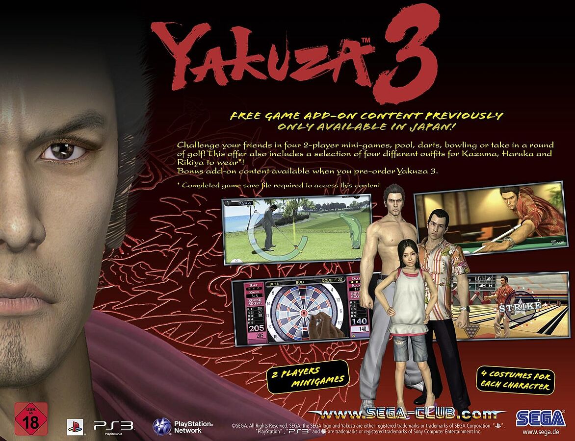 Vorbesteller von Yakuza 3 werden mit zusätzlichem, bisher auch nur in Japan erhältlichen Download Content belohnt. Dieser beinhaltet vier Mini-Games für 2 Spieler sowie vier extra Outfits für die Charaktere Kazuma, Haruka und Rikiya.
