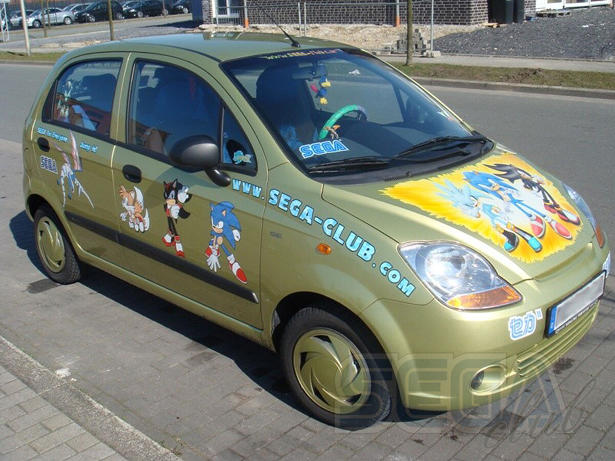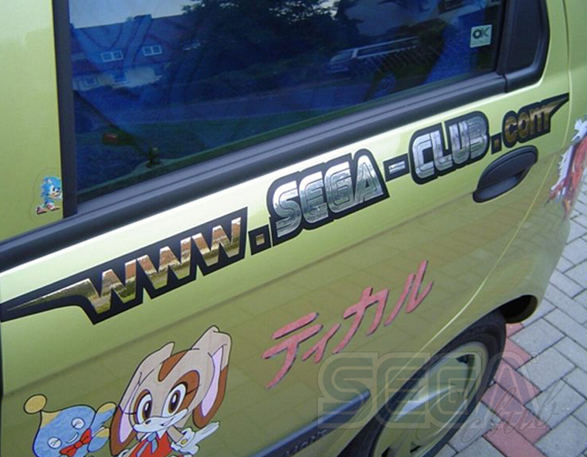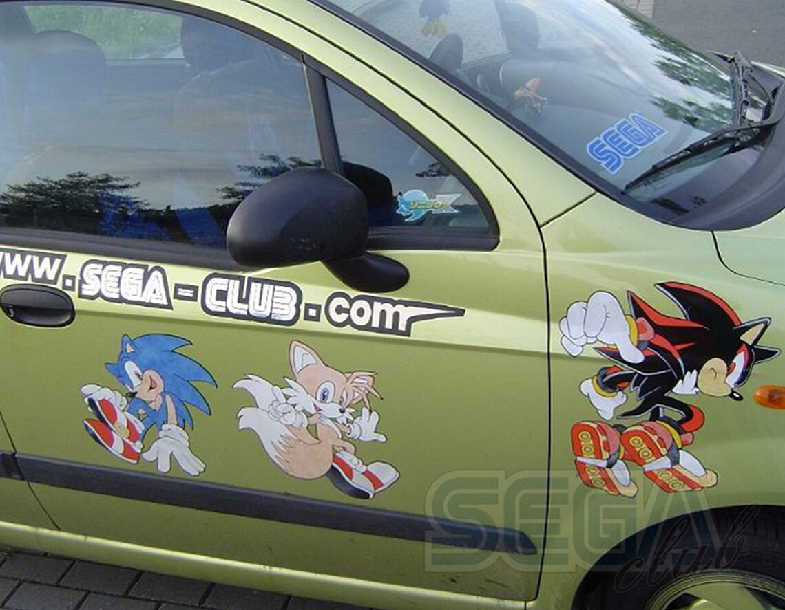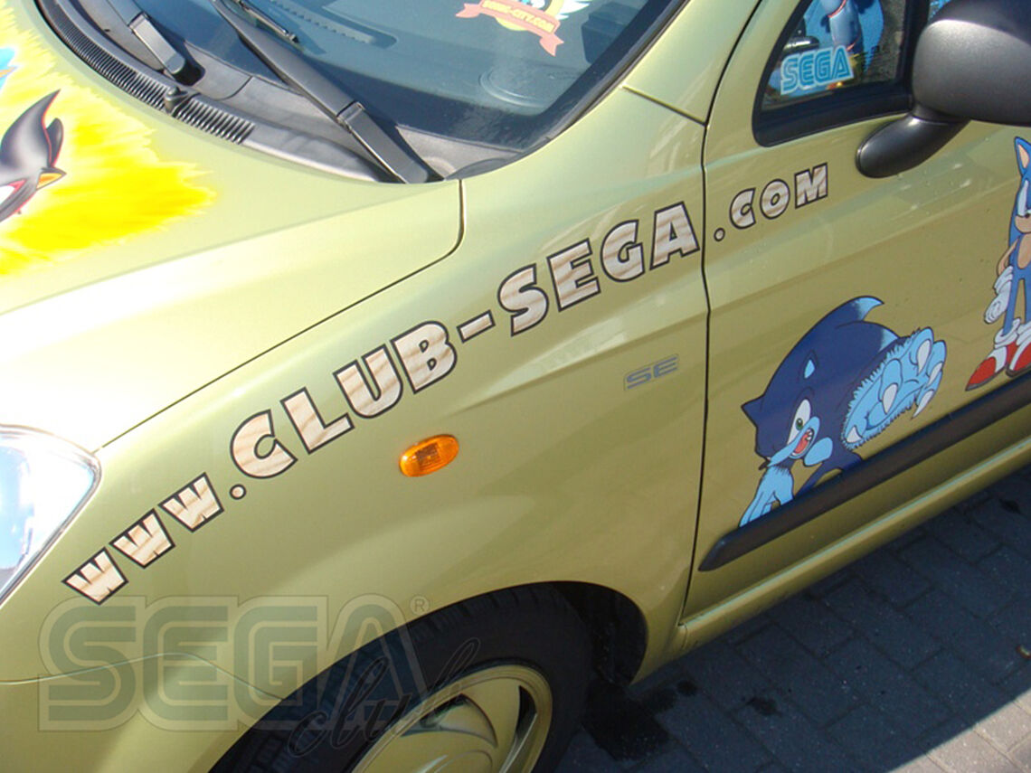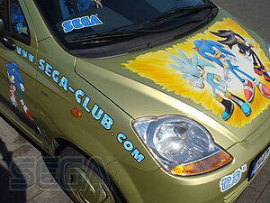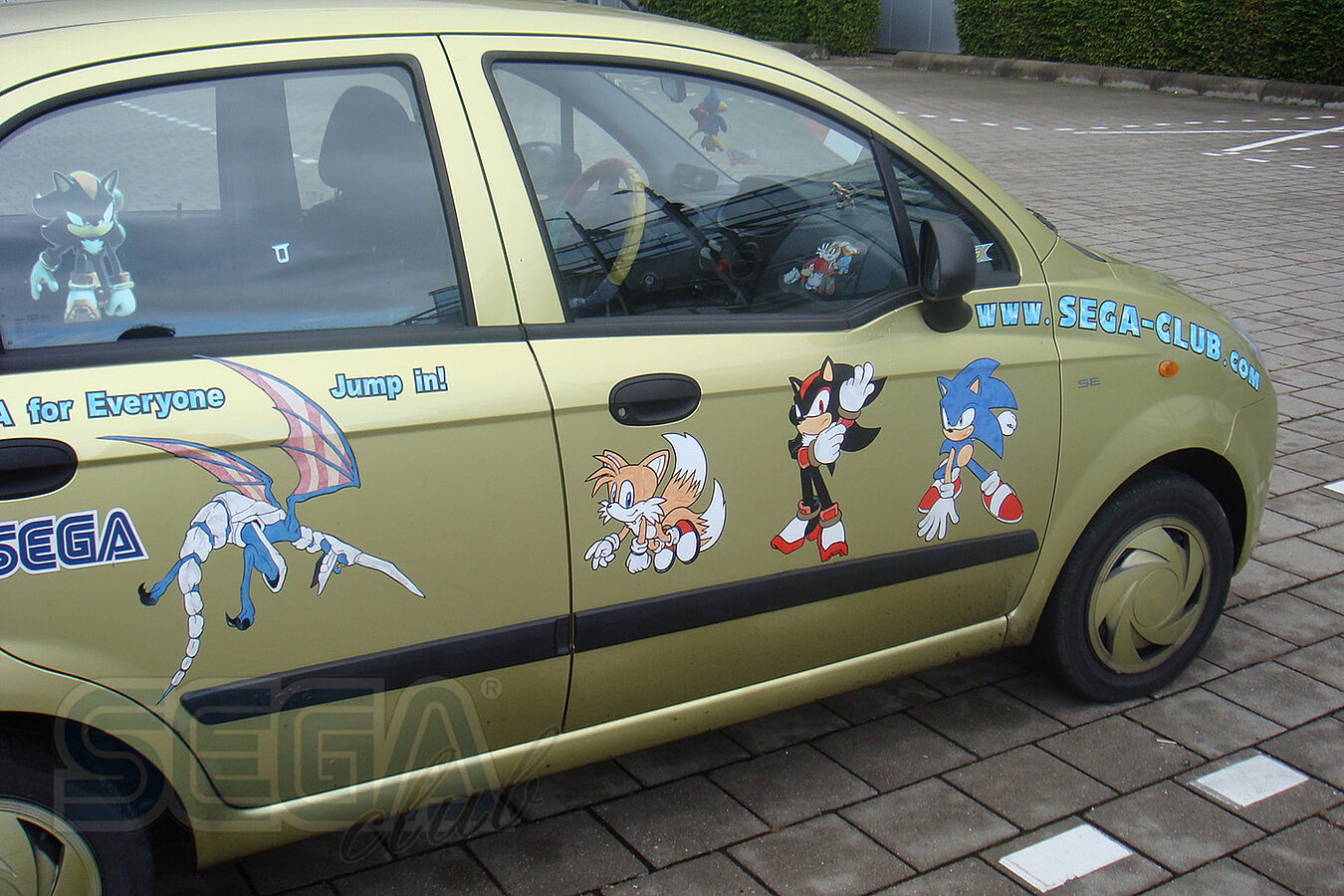 Mir kam der Einfall, für die Gestaltung der Karosserie einfach Aufkleber zu verwenden, die im Falle eines Garantieanspruches leicht zu entfernen wären. Doch woher nimmt man derartig große Aufkleber mit Motiven aus dem SEGA-Universum? Ganz klar… Man macht sie einfach selbst! So besorgte ich mir die nötigen Materialien und versuchte mich zunächst an kleineren Motiven, wie dem Sonic X-Logo und einem japanischen Schriftzug. Als diese Alltagstauglichkeit bewiesen und sogar der Autowaschanlage trotzten, folgten nach und nach weitere Motive, oder wurden durch neue, aufwendigere ersetzt. Schließlich kamen auch in technischer Hinsicht neue Spielereien dazu, wie beispielsweise eine rundum gehende, fernsteuerbare blaue Unterbodenbeleuchtung die mehrere Effekte beherrscht und zusätzliche Blinker, in Form von ebenfalls blauen LEDs, welche in den oberen Ecken des Heckfensters angebracht wurden. Schaltet man die Scheinwerfer ein, leuchtet zudem ein blaues Sega-Logo an der Stelle wo normalerweise die Bremsleuchte zu finden ist. Für die Zeit des Bremsvorgangs jedoch, schaltet ein Relais einfach wieder auf rot um, damit die vorgesehene Funktion auch weiterhin gewährleistet ist. Etwa ein Jahr später im Juni 2006, schickte ich schließlich Bilder von meinem mittlerweile gut mit Charakteren ausgestatteten Auto an SEGA, wodurch ich erste Kontakte aufbauen konnte und zudem auf sehr viel Zuspruch stieß. Fortan hielt ich SEGA über neue Ideen und Gestaltungen auf dem Laufenden, weshalb mein Auto dort schon bald sehr bekannt wurde. Schließlich fuhr ich das erste mal im August zur Games Convention 2006, wo der Kleine zum Publikumsmagnet wurde und mir dadurch den Kontakt zu einer deutschen SEGA-Seite ermöglichte, als ich selbst gebastelte Visitenkarte samt Notizzettel unter den Scheibenwischern vorfand. Kaum daheim, meldete ich mich in dem dortigen Forum an, wo ich schließlich ebenfalls dort angemeldete Mitglieder des SEGA-Clubs kennen lernte und nicht zuletzt auch wegen meines verrückten Autos zum Beitritt eingeladen wurde.