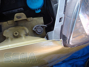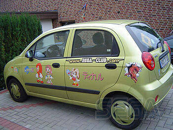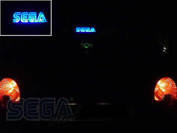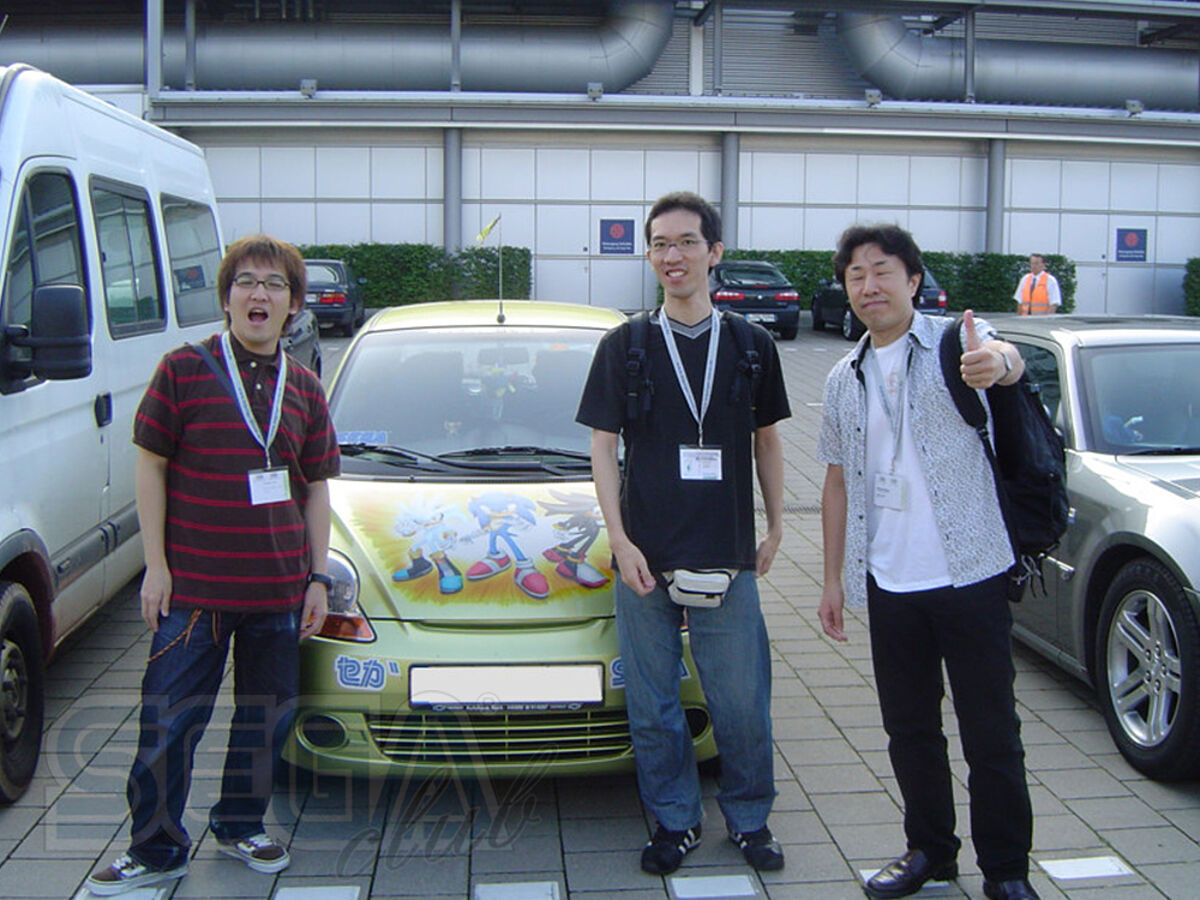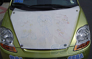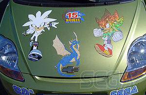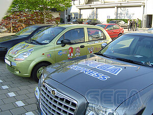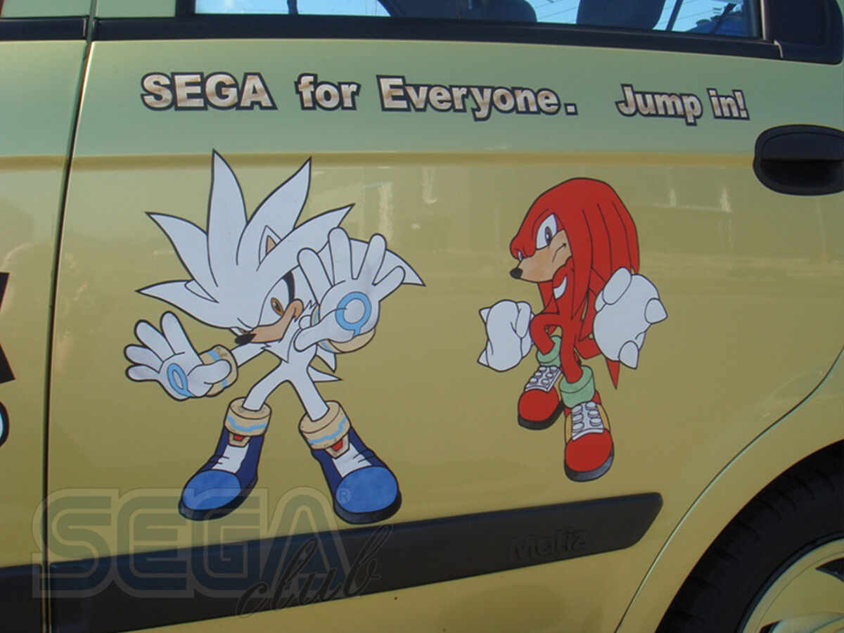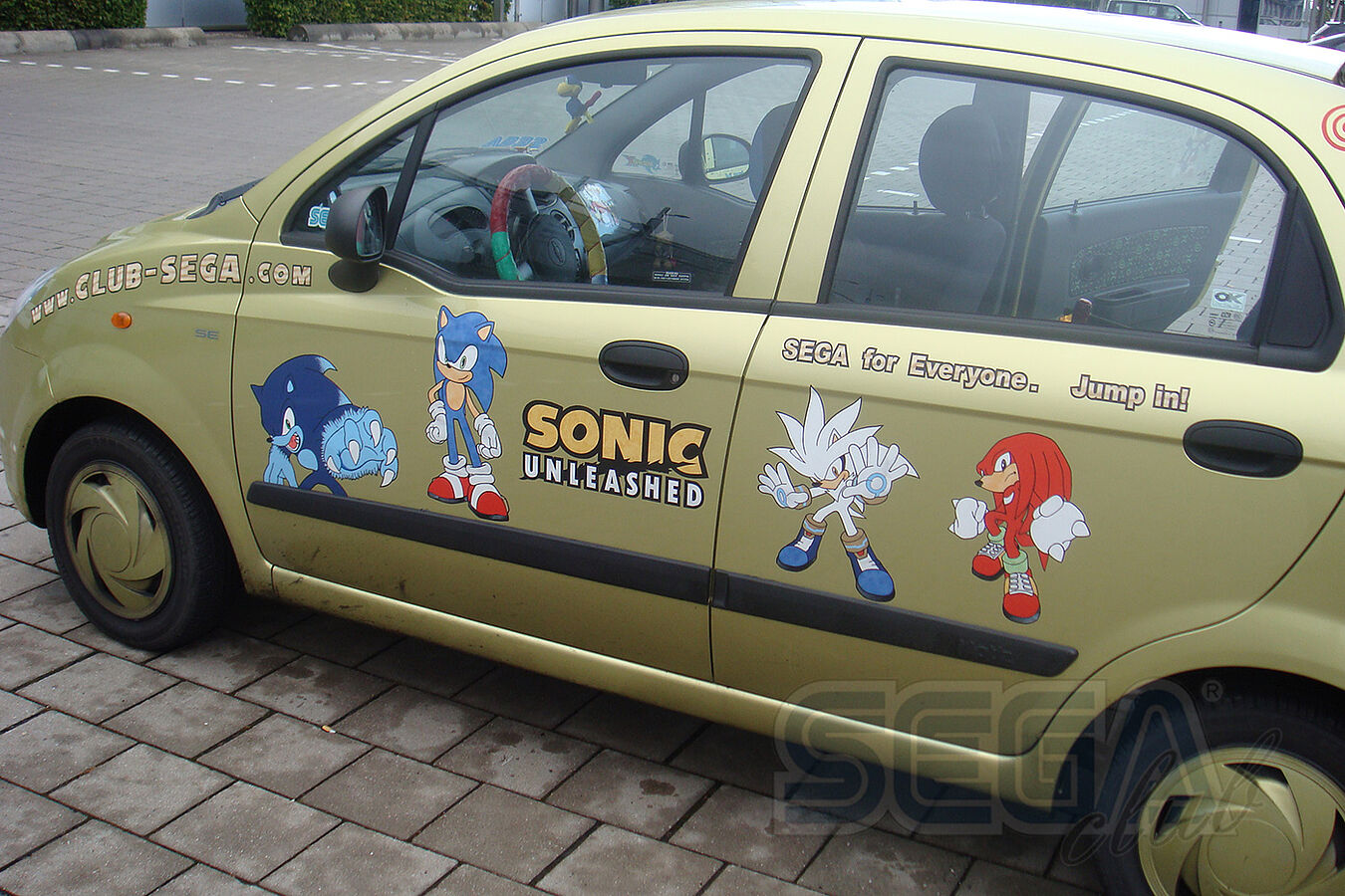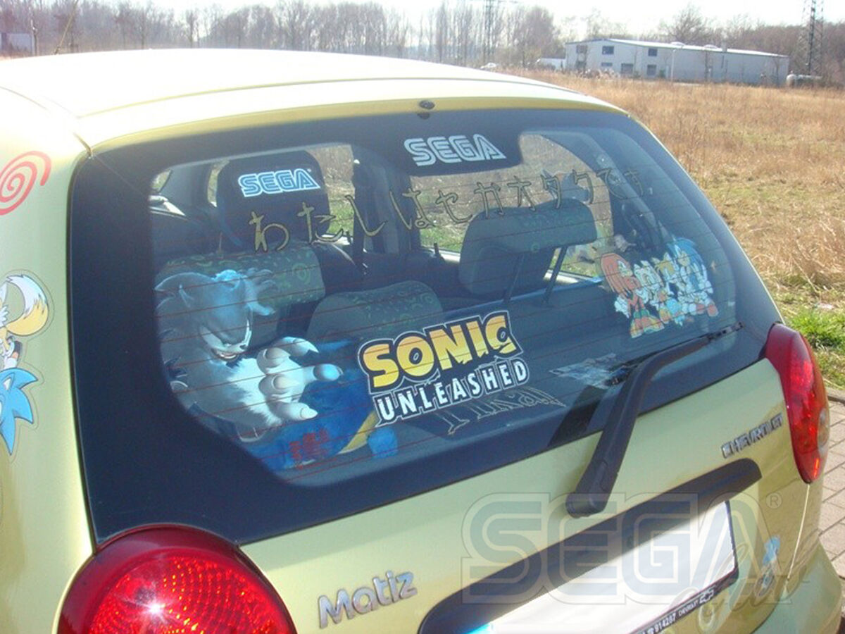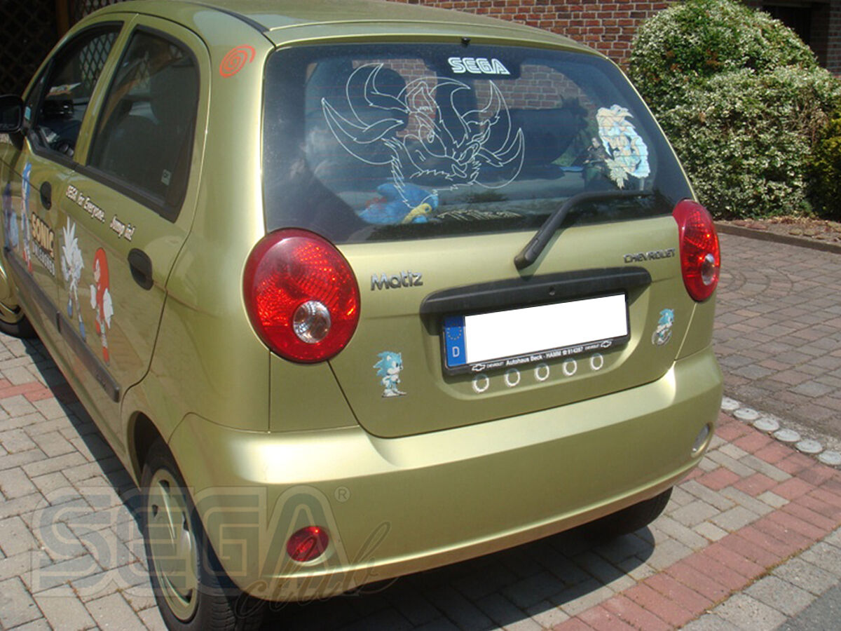Mir kam der Einfall, für die Gestaltung der Karosserie einfach Aufkleber zu verwenden, die im Falle eines Garantieanspruches leicht zu entfernen wären. Doch woher nimmt man derartig große Aufkleber mit Motiven aus dem SEGA-Universum? Ganz klar… Man macht sie einfach selbst! So besorgte ich mir die nötigen Materialien und versuchte mich zunächst an kleineren Motiven, wie dem Sonic X-Logo und einem japanischen Schriftzug. Als diese Alltagstauglichkeit bewiesen und sogar der Autowaschanlage trotzten, folgten nach und nach weitere Motive, oder wurden durch neue, aufwendigere ersetzt. Schließlich kamen auch in technischer Hinsicht neue Spielereien dazu, wie beispielsweise eine rundum gehende, fernsteuerbare blaue Unterbodenbeleuchtung die mehrere Effekte beherrscht und zusätzliche Blinker, in Form von ebenfalls blauen LEDs, welche in den oberen Ecken des Heckfensters angebracht wurden. Schaltet man die Scheinwerfer ein, leuchtet zudem ein blaues Sega-Logo an der Stelle wo normalerweise die Bremsleuchte zu finden ist. Für die Zeit des Bremsvorgangs jedoch, schaltet ein Relais einfach wieder auf rot um, damit die vorgesehene Funktion auch weiterhin gewährleistet ist. Etwa ein Jahr später im Juni 2006, schickte ich schließlich Bilder von meinem mittlerweile gut mit Charakteren ausgestatteten Auto an SEGA, wodurch ich erste Kontakte aufbauen konnte und zudem auf sehr viel Zuspruch stieß. Fortan hielt ich SEGA über neue Ideen und Gestaltungen auf dem Laufenden, weshalb mein Auto dort schon bald sehr bekannt wurde. Schließlich fuhr ich das erste mal im August zur Games Convention 2006, wo der Kleine zum Publikumsmagnet wurde und mir dadurch den Kontakt zu einer deutschen SEGA-Seite ermöglichte, als ich selbst gebastelte Visitenkarte samt Notizzettel unter den Scheibenwischern vorfand. Kaum daheim, meldete ich mich in dem dortigen Forum an, wo ich schließlich ebenfalls dort angemeldete Mitglieder des SEGA-Clubs kennen lernte und nicht zuletzt auch wegen meines verrückten Autos zum Beitritt eingeladen wurde.