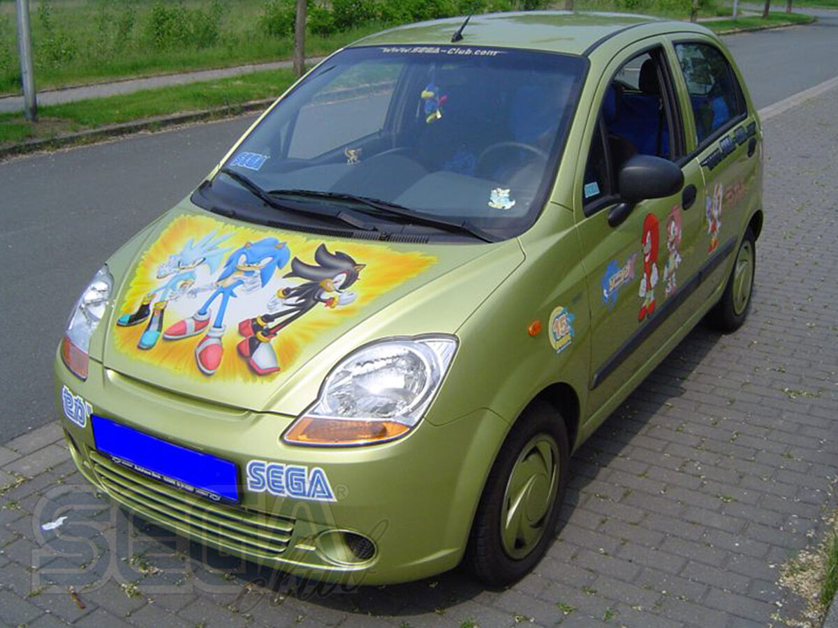 Eigentlich hätte es an diesem Tag, im Juni 2005, ein roter Chevrolet Matiz werden sollen. Doch nach einer Probefahrt mit dem Vorführwagen konnte es nur eine Farbe geben: Sie hört auf den schönen Namen Electric-Yellow-Metallic und erinnerte mich irgendwie an Sonic´s Goldringe. So kam es, dass ich den Schlüssel gar nicht mehr hergab, sondern gleich den erst wenige Tage alten und gerade mal 200 KM weit gefahrenen Vorführwagen kaufte! Da ich aber nicht nur mit Leib und Seele SEGA-Fan bin, sondern auch leidenschaftlich gerne bastle, sollte er nicht lange im Auslieferungszustand bleiben! Wegen der noch laufenden Garantie traute ich mich zwar noch nicht so recht an die Lackierung ran, doch klebte ich schon mal die ersten Bilder ins Heckfenster oder installierte technische Extras, wie eine 24-Melodien-Hupe oder eine Schwarzlichtlampe im Armaturenbrett.