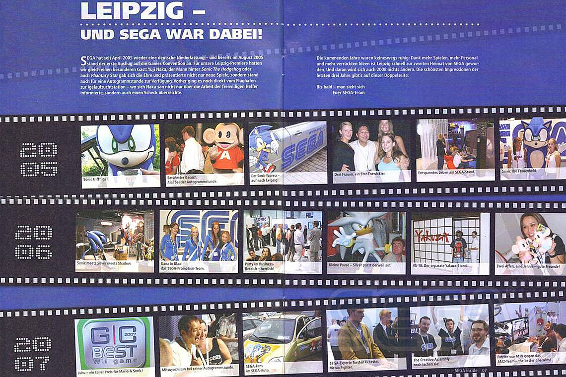 Viel Arbeit, eine verrückte Idee und viel Angstschweiß brachten dann doch noch das erlösende Siegel, ohne dass ich die mühselig ans Auto verankerte Technik und Verkabelungen entfernen musste. Nun ist das ganze zwar längst nicht mehr so stabil und sicher mit dem Auto verbunden… aber so war der TÜV damit endlich zufrieden. (Da verstehe einer die TÜV-Prüfer!) Na immerhin konnte es nun ohne Probleme zur GC2008 gehen, wo zu unser aller Überraschung das SEGA-Club Car in einer von SEGA veröffentlichten Zeitung auftauchte. Die kostenlos an die Besucher verteilten Sonderhefte zeigten ein Bild meines Autos als eines der GC-Highlight 2007 innerhalb eines doppelseitigen Extras mit einem kleinen Rückblick auf die vergangenen drei Jahre Games Convention mit SEGA. Für diese kleine Ehre sind wir wirklich dankbar und wir haben uns auch mächtig gefreut, zumal wir davon wirklich nichts wussten und das Bild erst Live vor Ort beim Durchblättern von SEGA inside entdeckten. Doch wir wussten daraufhin gleich: Das Bild entstand 2007 in dem Moment, als die Jungs von AM2 gerade dabei waren, das Auto von allen Seiten zu bewundern.