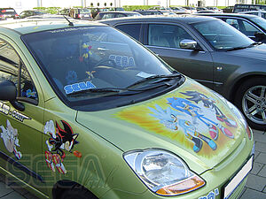Gleich am Zweiten Tag der Messe ergab es sich, dass wir uns kaum von Auto entfernen konnten als ein Fotograf an uns vorbei Richtung Auto lief und es aus mehreren Perspektiven zu knipsen begann. Er dachte wir wären von SEGA und das T-Shirt von AstroTiger mit dem Shenmue-Motiv eine Anspielung auf den langersehnten dritten Teil der Dreamcast-Saga. Nachdem wir ihn aufgeklärt hatten zeigte er sich zwar sichtlich enttäuscht bezüglich der Anspielung, ließ es sich jedoch nicht nehmen noch ein paar Fotos von uns und vom Auto zu machen. Weitaus weniger erfreulich war jedoch das Ende des dritten Tages, als ich beim Antreten der Heimreise eine Beschädigung am Panzer-Drachen-Aufkleber bemerkte. Nachdem er seit 2005 seinen festen Platz am Auto hatte, löste sich ganz plötzlich der Flügel und bot nun Wind und Schmutz eine unschöne Angrifffläche, weswegen das so auf keinen Fall bleiben durfte. Da ich jedoch zu sehr an dem Drachen hing, reparierte ich ihn erstmal notdürftig mit einem Stück durchsichtiger Klebefolie, die ich schützend über die gelöste Stelle klebte.