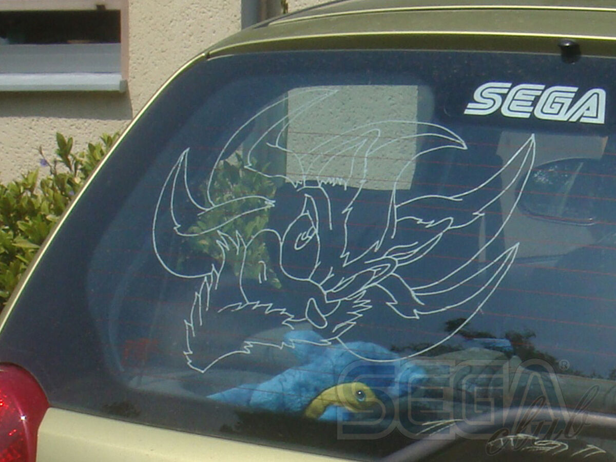 Als ich im Februar 2010 mal wieder die verblassten Bilder des Vormonats von der Heckscheibe entfernen musste, kam mir die Idee es mal mit UV-beständigen Windowcolors Motiven zu versuchen. Auf der Suche nach einem geeigneten Bild stieß ich auf eine Shadow-Zeichnung von ShiShiKo, die sie mal auf der [play2008] angefertigt hatte. Shadow hatte tatsächlich die perfekte Größe und passte ganz genau in die Scheibe hinein, weshalb ich sogleich damit begann die Linien mit Windowcolor nachzuziehen. Später im Mai war es dann um den Panzer Drachen geschehen, da sich das durchsichtige Stück Folie voller Schmutz und Wasser gezogen hatte. Er musste ab, wobei ich ihn jedoch an einem Stück retten und Daheim in der Wohnung neu verkleben konnte. Vorher jedoch hatte ich für die Stelle wo der Drache war einen neuen Auto-Aufkleber vorbereitet: Den Werehog, den ich nach einer Skizze von S-CAT-Member ShiShiKo angefertigt hatte.