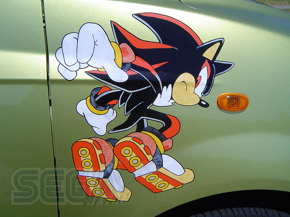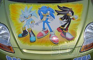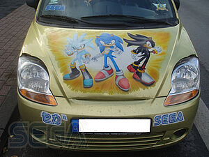 Ende April 2007, als die ersten Sonnenstrahlen einen milden Frühling einläuteten, sollte schließlich das nächste Projekt in Angriff genommen werden: Ich scheute nicht länger davor die Lackierung zu ändern und fand einen Airbrush-Künstler, der die Motorhaube meines Autos mit einem großen Sonic Motiv versehen sollte. Es artete zwar in viel Arbeit aus die alten Aufkleber restlos zu entfernen und ich musste einige Tage auf mein geliebtes Auto verzichten, doch sollten fortan die drei Kultigel Sonic, Shadow und Silver die Front meines mittlerweile SEGA-Club-Car getauften Autochens zieren und für reichlich Aufmerksamkeit sorgen, was jeden Aufwand wert war! Shadow wurde dabei bewusst auf der Straßenseite positioniert, da er nach Meinung des Künstlers den anderen Autofahrern nun mit der Faust drohen konnte.