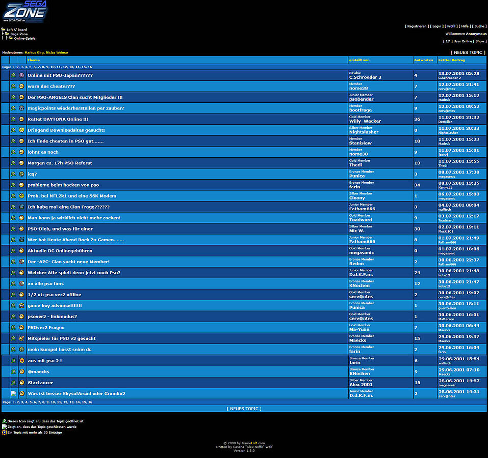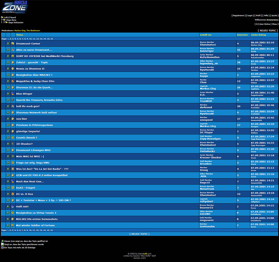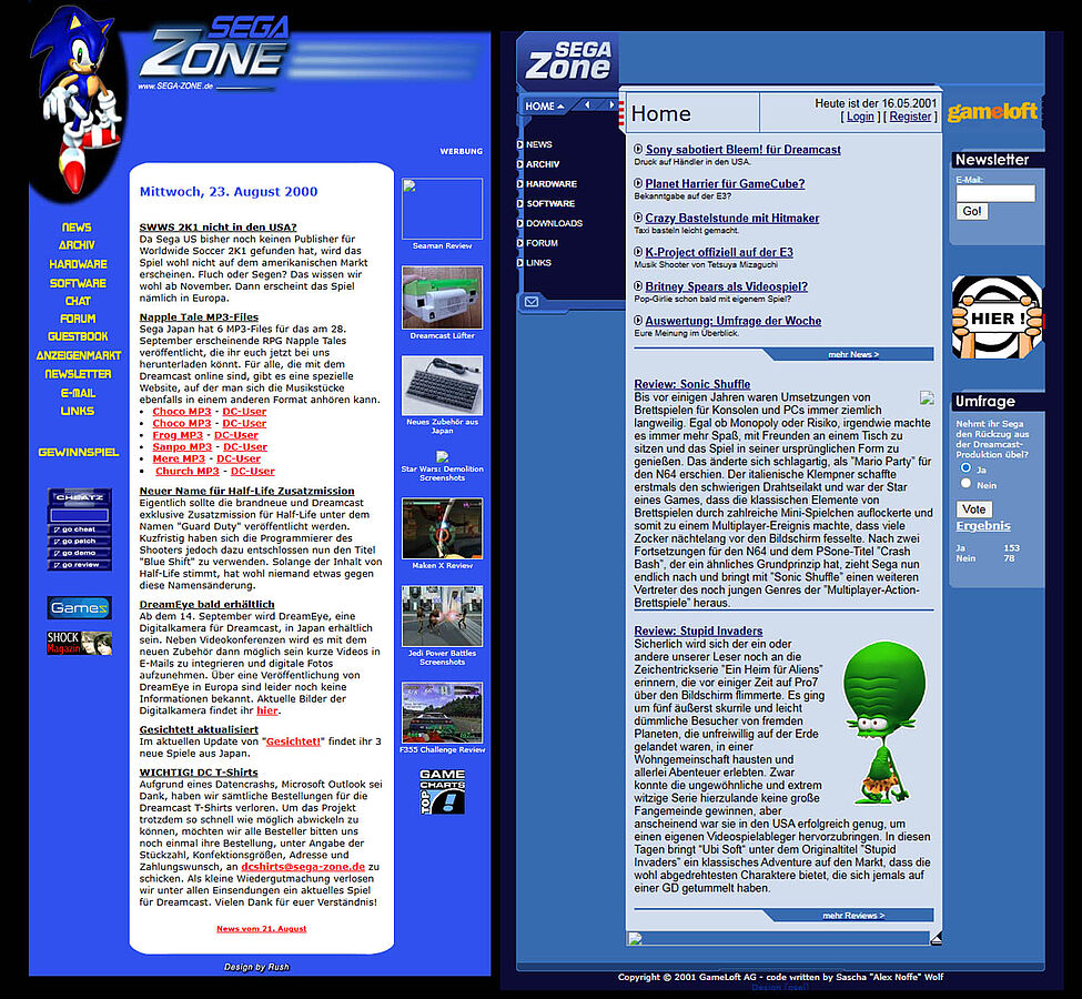 Weiterhin bemerkbar machte sich: Das Forum der Sega-Zone wurde innerhalb des „Loft // board“ eingegliedert. Der „Anzeigenmarkt“ stand nun im Forum bereit, neben einem „OT-Forum“, den „Sega Diskussionen“ und der „Online-Spiele“. Im August 2001 hatten die Beträge innerhalb der Sega Diskussionen übrigens die 200.000er Marke durchbrochen. Aber eine Sache wirkte sehr nach: SEGA hatte das Aus der Dreamcast-Konsole Ende März 2001 verkündet. Die Sega-Zone veranstaltete hierzu sogar ein Voting auf der Hauptseite, die das Thema aufgriff: „Nehmt ihr Sega den Rückzug aus der Dreamcast-Produktion übel?“ Ein Archiv-Bild zeigt: 153 Besucher stimmten bis 16.05.2001 für ja, 78x wurde für nein gestimmt. Damals rangierten „Sony sabotiert Bleem! für Dreamcast“ und „K-Project offiziell auf der E3“ ganz in den Newsmeldungen. Am 29.11.2001 waren dies dagegen bereits Meldungen wie „US-Dreamcast-Preis fällt unter 50 Dollar“, „Xbox-Version von Shenmue II“ oder das „Aus für Bleem!“. Kurz vorher im Oktober 2001 hatten die „Sega Diskussionen“ im Sega-Zone Forum des Loft-Boards bereits mehr als 211.000 Beiträge.