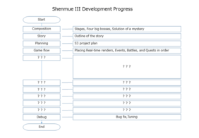 A: Please take a look at this diagram. So far, we have finished the composition, story, planning and the game flow. We will be advancing to the next development step soon.