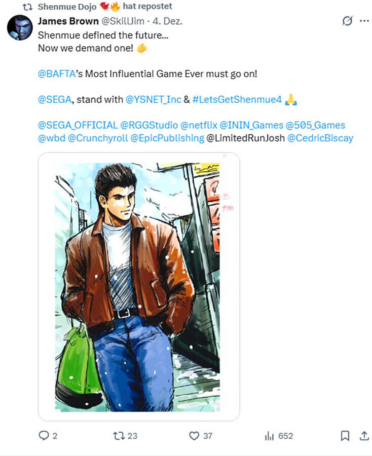 Shenmue feierte bei den westlichen Fans (Release: November/Dezember 2000) sein offizielles Jubiläum in 2025. Zwar reagierte SEGA nicht direkt auf diese Rally, dennoch schien man der Marke zunehmend mehr Respekt zu zollen: SEGA setzte offizielle Beiträge zum Jubiläum ab, was bei den Rally-Teilnehmern durchaus als Erfolg gewertet wurde. Yu Suzuki, Schöpfer der Shenmue-Serie, bedankte sich regelmäßig bei der Community für ihre Unterstützung, wenngleich er die monatliche Rally nicht zwingend namentlich nannte oder konkret neue Projekte vorstellte. Doch das Thema ist heiß: Bereits in 2023 erwähnte er ein mögliches Prequel als „Shenmue Zero“ oder wie er mit einem Shenmue IV auch Neulinge ansprechen wolle.