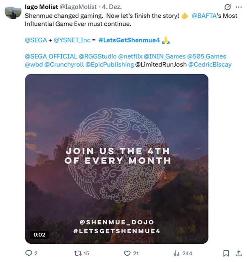 Die Shenmue-Rally-Kampagne verdeutlichte zudem die wachsende Popularität und kontinuierlich steigende Reichweite auf den Plattformen X (ehemals Twitter) und zunehmend Blue Sky, aber natürlich auch Instagram oder Facebook. Fans weltweit nutzen koordinierte „Mass-Tweets“ zu festen Uhrzeiten (9:00 Uhr und 21:00 Uhr deutscher Zeit), um eine maximale Reichweite zu erzielen – an jedem 4. Tag des Monats. Damit trendete der Hashtag #LetsGetShenmue4 jeden Monat in Folge ein weiteres Mal und schaffte es regelmäßig in die globalen Top 10 bis 20 der Charts. Im Jahr 2025 lag das Ziel oft bei über 10.000 Posts pro Rally-Tag. Im Dezember 2025 gab es bereits 21 Monate in Folge in den Trends – dies zum 25-jährigen Jubiläum von Shenmue. Die 10.000 Posts sind eine Marke, die die Shenmue-Community spätestens seitdem mit jedem weiteren Rally-Call anstrebt, auch um die Sichtbarkeit bei potenziellen Partnern zu maximieren, darunter auch ININ Games, welche 2025 bereits erste wichtige Schritte für die Marke einleiteten. Natürlich dürfte es für Fans weitaus mehr freuen, wenn SEGA sich ihrer hauseigenen Serie selbst wieder annimmt und gemeinsam mit YS Net, Yu Suzukis Studio, entwickelt – auch in Zusammenarbeit mit dem eigenen RGG Studio.