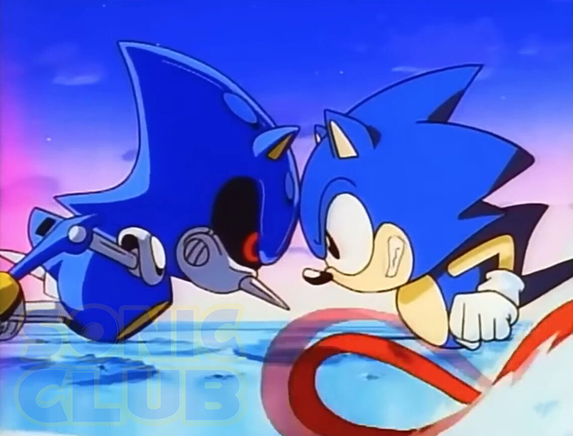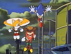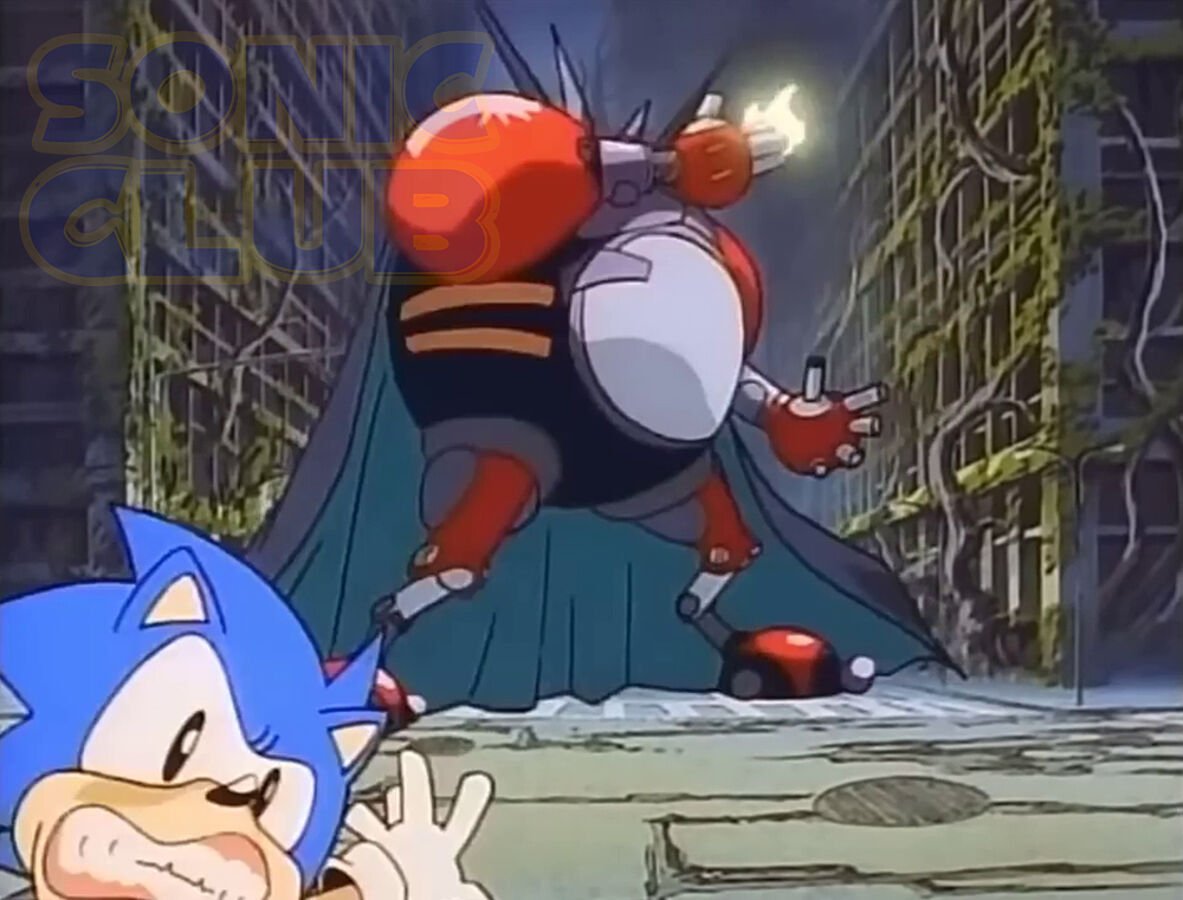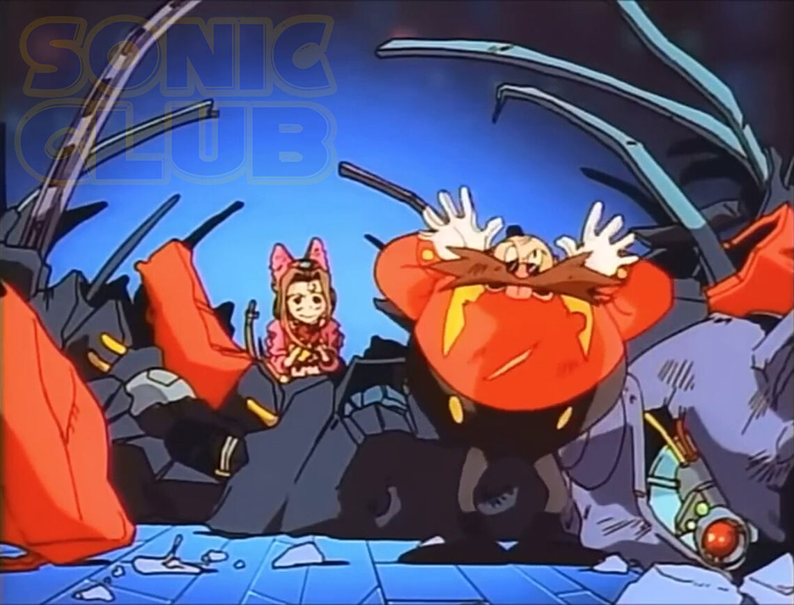 Genauer gesagt, spielt er mit Sara so etwas wie ein Hologramm-Virtua Fighter. Seine Roboter putzen derweilen die Fenster. Doch etwas durchbricht die Wände des Büros. Sara erkennt darin sofort eines von Robotniks Fahrzeugen und will unbedingt damit fahren. Schon verschwinden sie und Robotnik mit der merkwürdigen Maschine. Inzwischen schafften es auch Sonic und Tails nach dem Überwinden etlicher Fallen zur Stadt, die New York durchaus ähnlichsieht. Aber sie liegt völlig im Dunklen und droht ganz langsam im Meer zu versinken. Ein riesiger Roboter tut sich im dunklen Gewand vor ihnen auf und gibt sich als Metal-Robotnik zu erkennen. Er eröffnet sofort das Feuer. Seine klebrige Munition erwischt Tails, der nun hoffnungslos an einem Zaun festhängt. Auch Sonic bleibt an den Kleberesten am Boden hängen. Da eilt Knuckles ihnen zu Hilfe, der das Spektakel während seiner Schatzsuche in der Nähe bemerkte. Nach einem Kampf gegen die drei Helden wird es Metal-Robotnik etwas zu heikel und macht sich zunächst mit Drohungen aus dem Staub. Wie es weitergeht? Dies erfahrt ihr im Film...