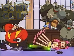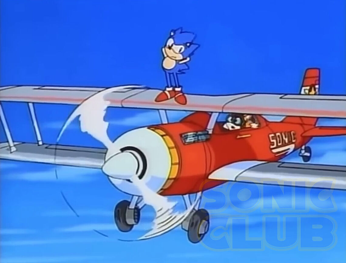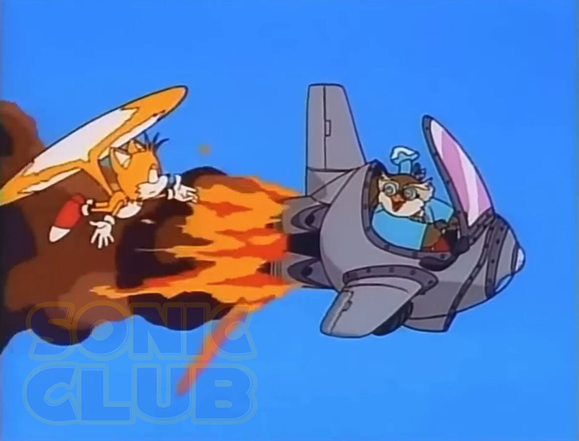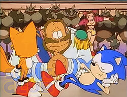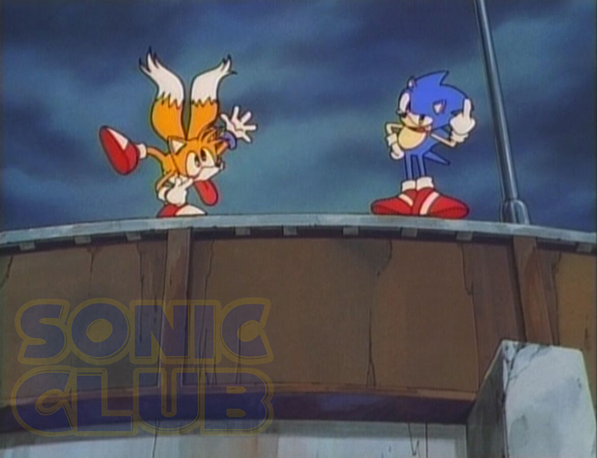 Genauer gesagt, spielt er mit Sara so etwas wie ein Hologramm-Virtua Fighter. Seine Roboter putzen derweilen die Fenster. Doch etwas durchbricht die Wände des Büros. Sara erkennt darin sofort eines von Robotniks Fahrzeugen und will unbedingt damit fahren. Schon verschwinden sie und Robotnik mit der merkwürdigen Maschine. Inzwischen schafften es auch Sonic und Tails nach dem Überwinden etlicher Fallen zur Stadt, die New York durchaus ähnlichsieht. Aber sie liegt völlig im Dunklen und droht ganz langsam im Meer zu versinken. Ein riesiger Roboter tut sich im dunklen Gewand vor ihnen auf und gibt sich als Metal-Robotnik zu erkennen. Er eröffnet sofort das Feuer. Seine klebrige Munition erwischt Tails, der nun hoffnungslos an einem Zaun festhängt. Auch Sonic bleibt an den Kleberesten am Boden hängen. Da eilt Knuckles ihnen zu Hilfe, der das Spektakel während seiner Schatzsuche in der Nähe bemerkte. Nach einem Kampf gegen die drei Helden wird es Metal-Robotnik etwas zu heikel und macht sich zunächst mit Drohungen aus dem Staub. Wie es weitergeht? Dies erfahrt ihr im Film...