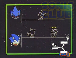 Dabei wurden sogar bisher nicht genutzte und nur als Skizzen vorhandene Szenen aus dem Sonic CD „Pencil Test“ mit in die Szenen integriert, die erst sehr viel Später in Sonic Jam wieder auftauchen sollten. Für eine digitale Anzeige von Metal Sonics Status griff man bei der Darstellung auf Zeichnungen zurück, wie sie zu Mega Drive Zeiten in Japan noch in den Anleitungen zu finden waren. Kleine Skizzen der Entwickler, die auf witzige Art und Weise die Charaktere und vor allem ihre Stimmung gut erkennen lassen. In diesem Beispiel stammen die kleinen Zeichnungen (rechts im Bild) aus der japanischen Anleitung zu Sonic the Hedgehog 2 auf dem Mega Drive.