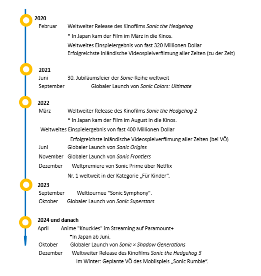 Neben diesem Spiel werden wir unsere medienübergreifende Entwicklung mit dem Handyspiel Sonic Rumble™ vorantreiben, das in diesem Winter auf den Markt kommen soll, sowie mit der Ausstrahlung der „Knuckles“-Show auf Paramount+ und der weltweiten Veröffentlichung des Films „Sonic the Hedgehog 3“, der voraussichtlich im Dezember dieses Jahres in die Kinos kommt. So arbeiten wir daran, die Bekanntheit der Sonic-IP weiter zu steigern und unsere Marke auszubauen.