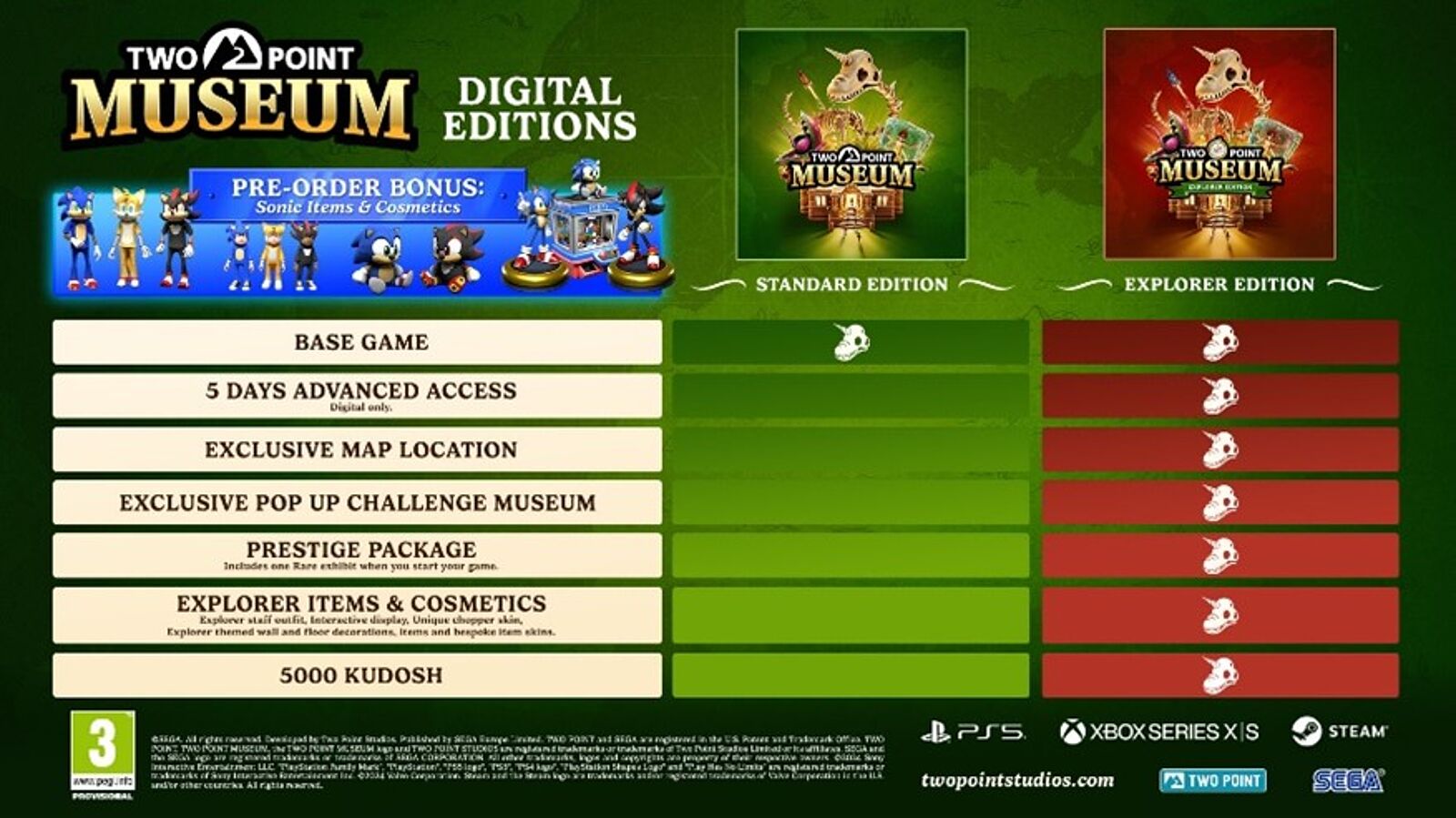 Zusammen mit der Bekanntgabe, dass die Vorbestellungsphase beginnt, hat Two Point Studios außerdem die Explorer Edition von Two Point Museum enthüllt, die exklusive Inhalte und das Sonic-Vorbestellpaket beinhaltet.