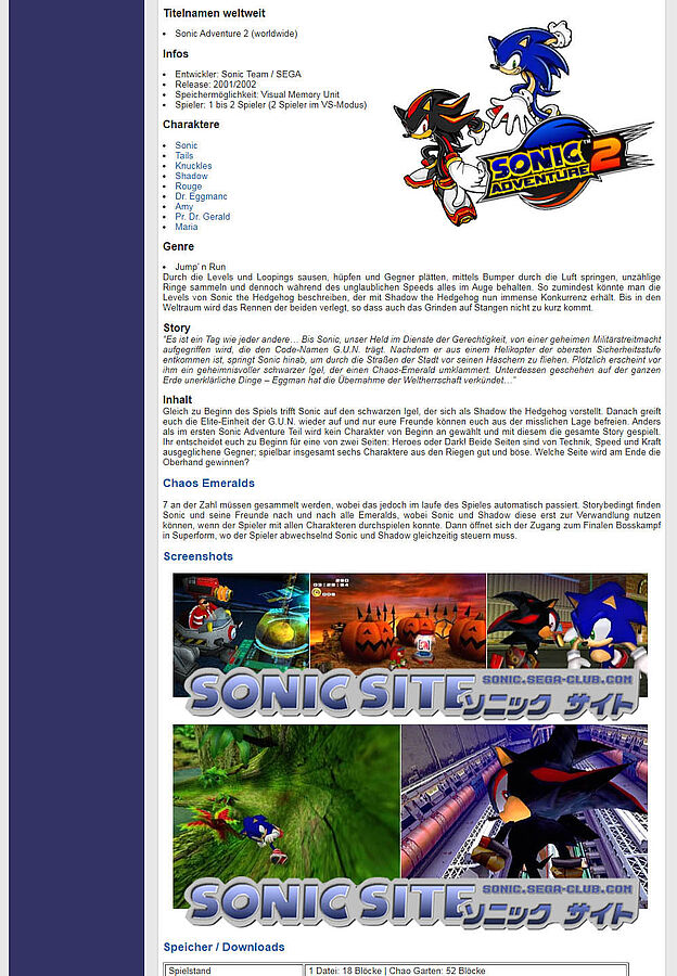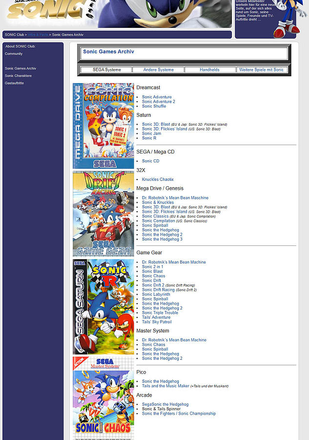 Ein Kernanliegen beim Aufbau der SONIC Site war von Beginn an die perfekte Usability. Wir wollten ein System schaffen, in dem Gäste sich nicht in Untermenüs verlieren. Archive, Software-Beschreibungen und Testberichte wurden direkt miteinander verzahnt: Ein Klick sollte genügen, um zwischen Spielarchiven und Reviews hin- und herzuwechseln. Um die Flut an Titeln zu bändigen, strukturierten wir das Archiv in SEGA-Systeme, Third-Party-Plattformen, Handhelds und Gastauftritte. Besonders stolz waren wir auf unser modulares Text-Konzept. Da die Informationslage je nach Spiel stark variierte, entwickelten wir eine Gliederung, die sowohl für Retro-Klassiker als auch für zukünftige Titel funktionierte. Dieser „zukunftsweisende Stil“ erlaubte es uns, Artikel jederzeit zu erweitern, ohne den Lesefluss zu stören. Dadurch könnten wir auch schnell und einfach zu Hintergründen oder Tipps & Tricks wechseln – ein Prinzip, das wir auch auf die Charakter-Datenbank übertrugen.