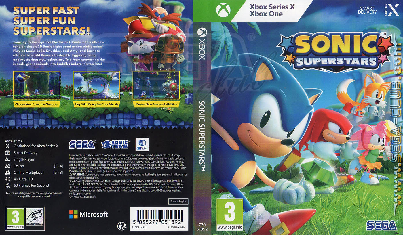 Die Sonic Superstars PC-Box wurde exklusiv auf Amazon angeboten. Diese kommt ohne DVD-Box zum Herausziehen. (Auch ohne den Sonic.) Stattdessen beinhaltet der Pappschuber eine aufklappbare Box mit einem Fach für die Kurzanleitung und einem LEGO-Flyer. Diese Box ist ganz im Stil von Sonic Superstars gestaltet. Eine DVD befindet sich allerdings auch in dieser "Design-Pappe" nicht. Lediglich ein Code ist hier aufgeklebt, der auf der Steam-Plattform eingelöst wird. Sprich, dies ist eine Box mit rein digitalem Inhalt ohne Datenträger.